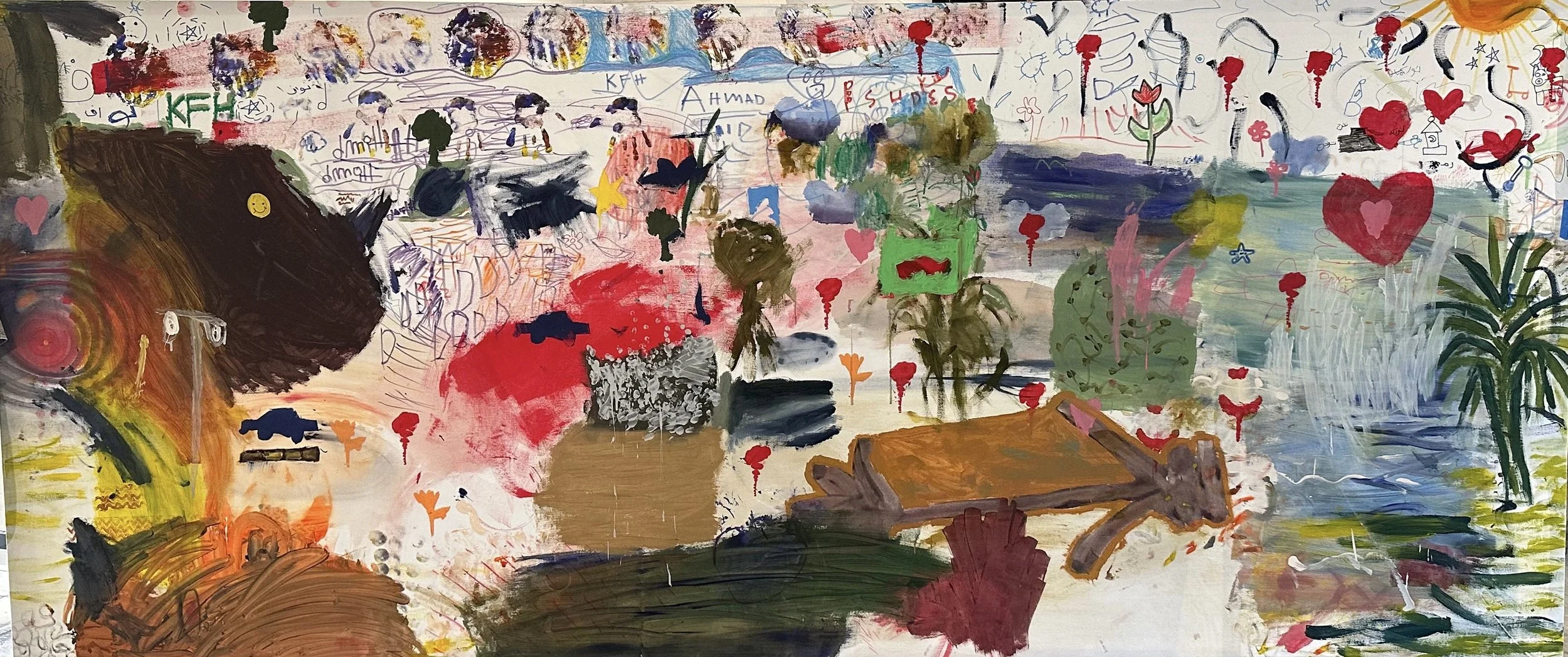 This large, collaborative artwork pulses with the optimism and collective energy of the many hands that contributed to it. Created during a charity event led by Kaia Al Mutawa, the piece is a vibrant testament to communal action and joyful engagement. Despite any lack of formal training or confidence, each participant—whether an experienced artist or a nervous novice—boldly placed their unique marks on the canvas, transforming it into a dense tapestry of color and form.