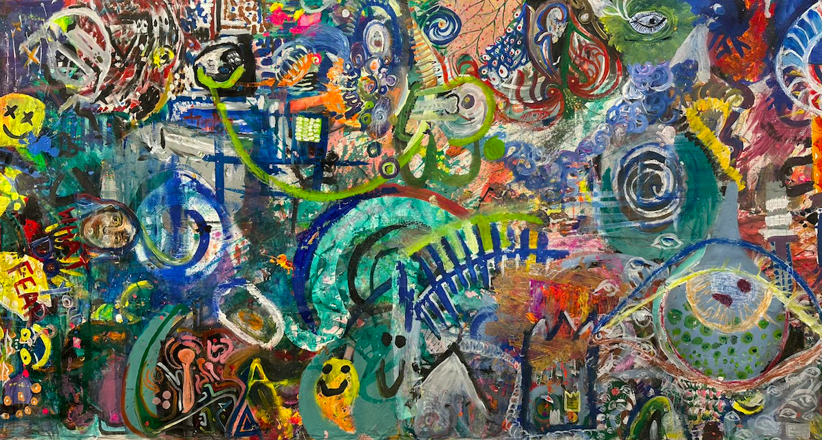 This painting ‘72 Hours’ embodies a joyous, expansive open optimism, reflecting the unique environment of its creation: a continuous 72-hour open-studio experience. Breaking from the artist’s usual horizontal start, this large vertical canvas became an ‘field of expression’ welcoming marks from a community of creators who shared a harmonious, positive energy.